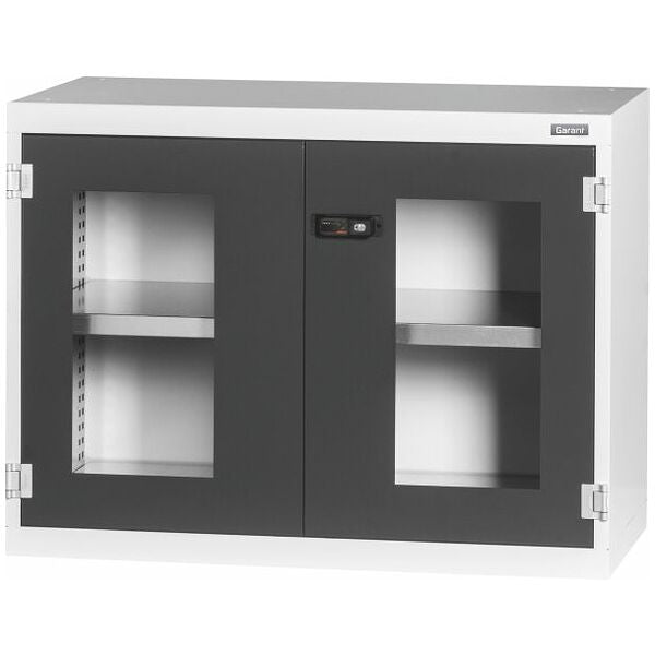 Equipped cabinet in 40×20G. Mountings for shelves at 25 mm intervals. Swing doors reinforced on the inside and can be locked by 2-component Haptoprene® slide handle with a cylinder lock. Levelling base for base cabinets, with 4 individually adjustable feet to compensate for unevenness in the floor. In the base cabinet the push handle is mounted in the upper part of the door; in the top-mounted cabinet it is in the lower part of the door.