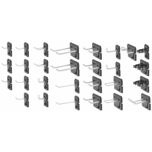 Simple insertion in a perforated panel with just one hand, no tools required. Fixed retention without screw fastening, thereby avoiding scratches on the perforated panel.
