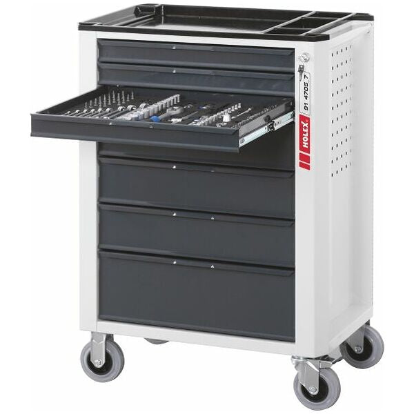 The stable sheet metal construction of the roller cabinet includes an ABS tray and push handle. Drawer unlocked by lifting the drawer.