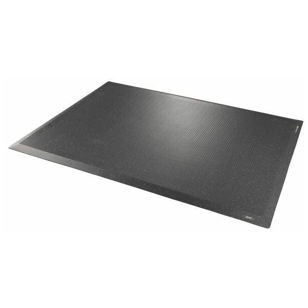 Industrial workplace mat for medium to heavy-duty requirements. The ergonomic rubber mat is suitable for dry and wet walking and standing workplaces. The mat surface has an optimally coordinated pivot point and very good slip resistance and position stability. Bevelled edges on all sides to avoid the risk of stumbling. Very easy-to-clean surface with light-reflecting properties.