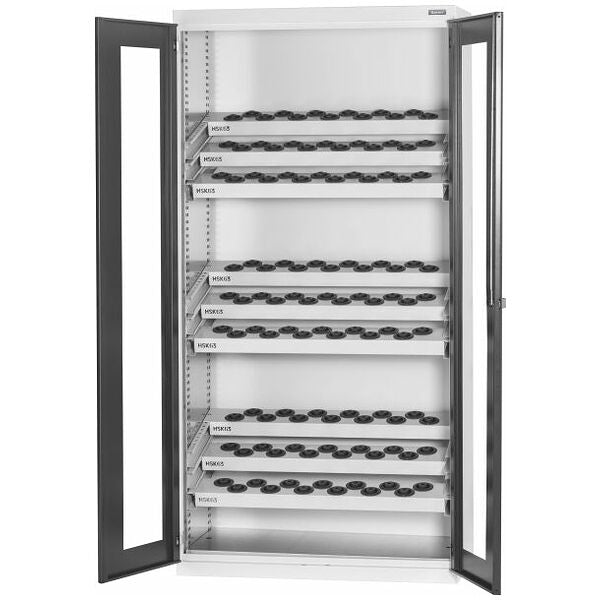 Equipped cabinet in 40×20G. With mounting rails adjustable in 25 mm intervals. Swing doors reinforced on the inside and can be locked by 2-component Haptoprene® slide handle with a cylinder lock. Levelling base with 4 individually adjustable feet to compensate for unevenness in the floor. Maximum load capacity per mounting rail pair 200 kg, per tool block insert rail 150 kg.